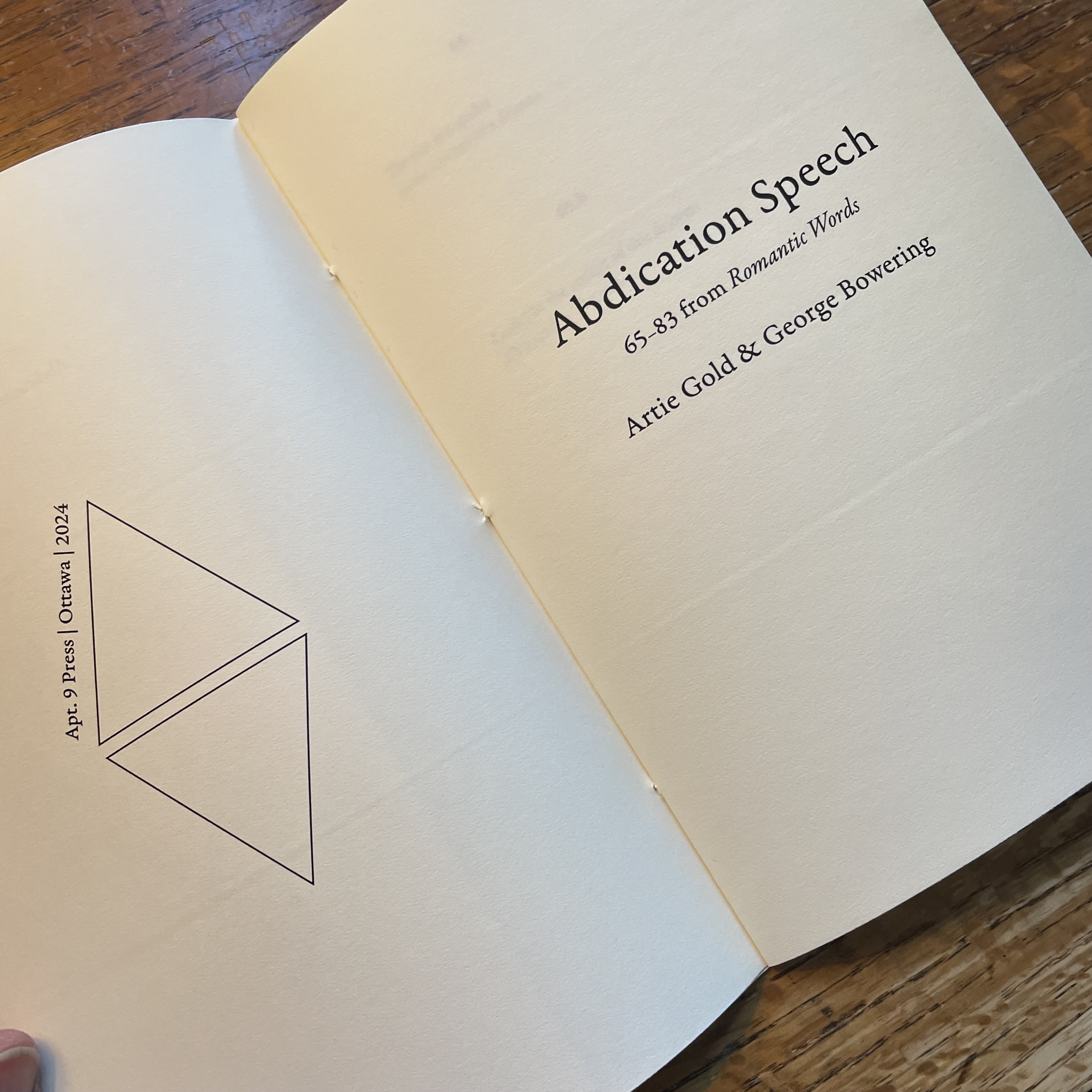 Apt. 9 previously published Romantic Wounds, a selection from the same project. Other excerpts have been published (or will be published) by Proper Tales Press, Nose in Book Publishing, Laurel Reed Books, Turret House Press, and above/ground press.