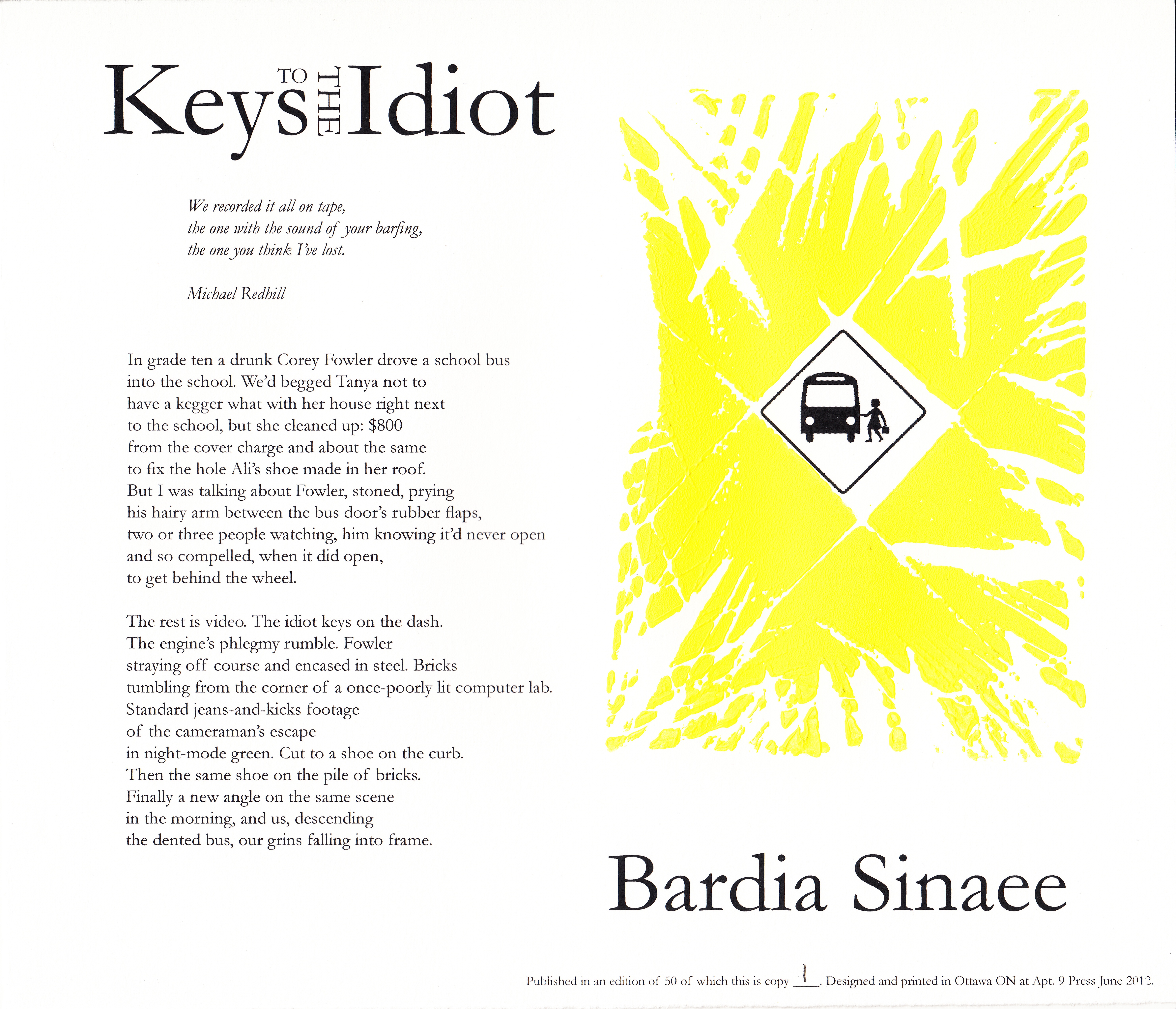 Bardia Sinaee | Keys to the Idiot 8.5×10, /50, $5.00 Published in a numbered edition of 50 copies. Poetry (June 2012) Share this: Click to share on Facebook (Opens in new window) Facebook Click to share on X (Opens in new window) X Like Loading...