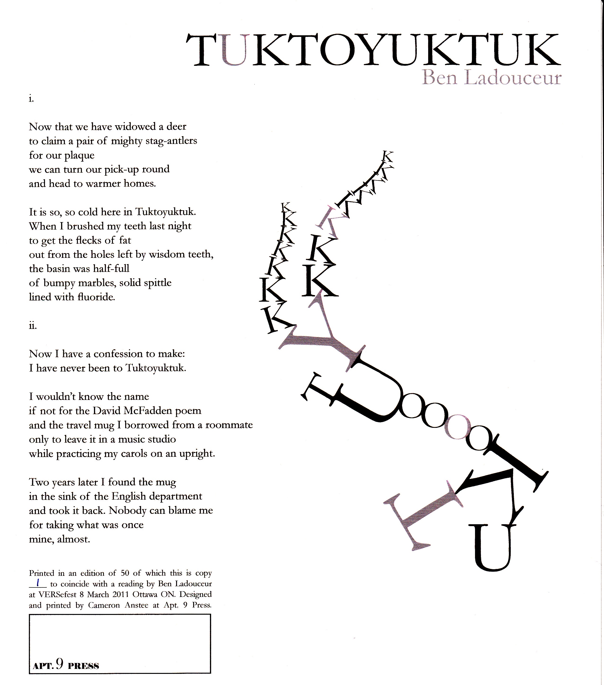 Printed in an edition of 50 copies to coincide with a reading by Ben Ladouceur at VERSefest 8 March 2011 Ottawa ON.