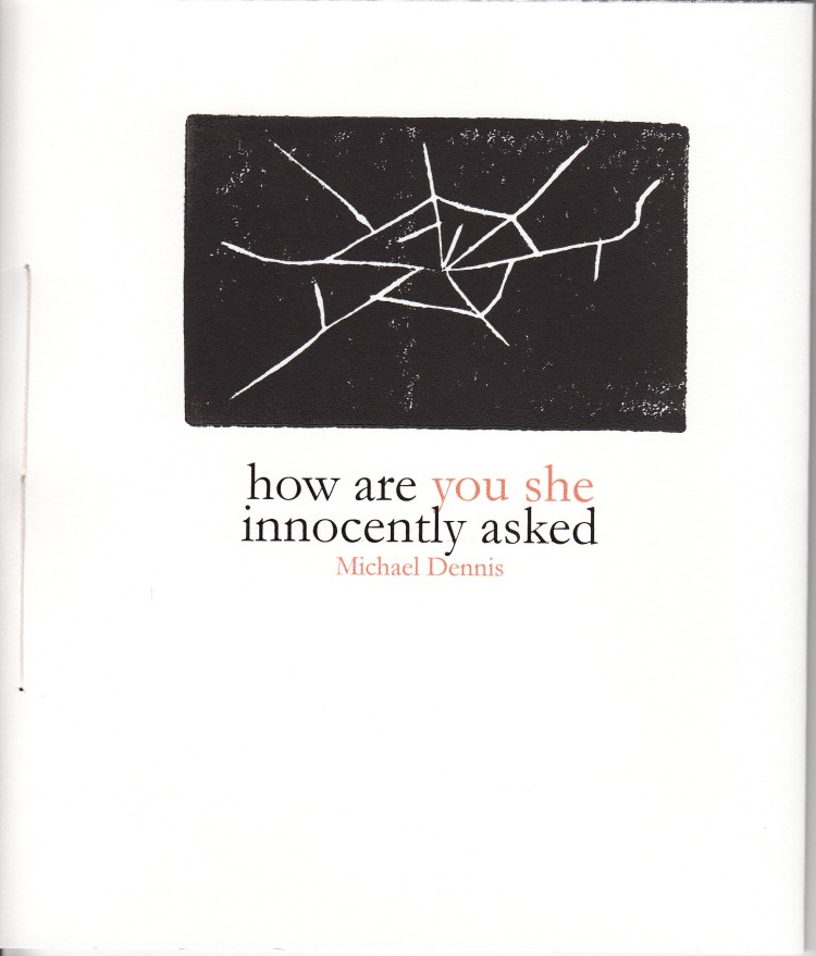 how are you she innocently asked is comprised of poems and short short stories, all marked by Dennis’ characteristic lack of bullshit. In turns brutally honest, hilarious, and surreal, the book follows on the heels of 2009’s Coming Ashore on Fire (Burnt Wine). The cover features an original linocut, hand printed for each book.