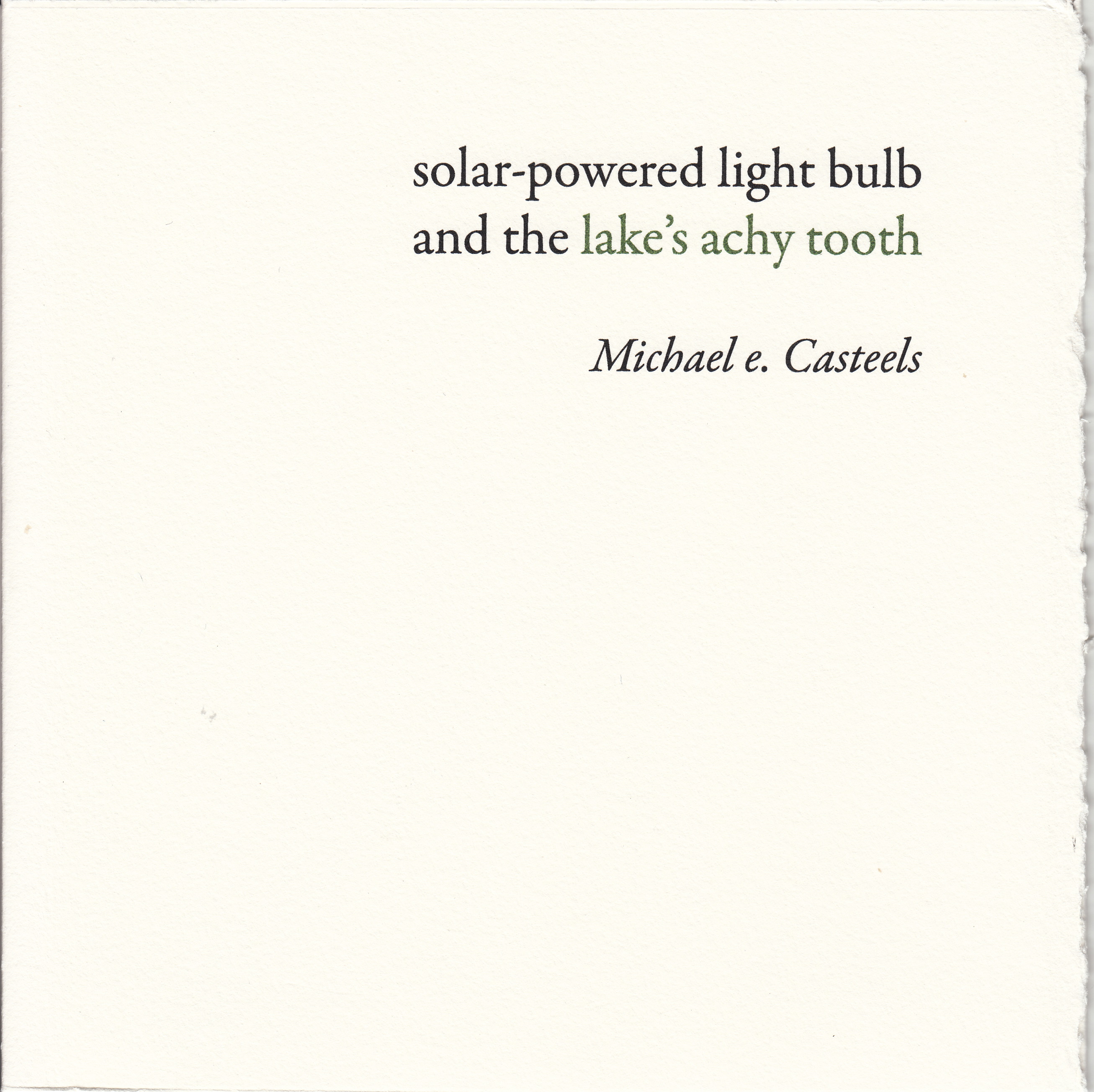 Michael e. Casteels, editor and publisher of Puddles of Sky Press (Kingston), is among the most deliberate and careful (and exciting!) micro press publishers operating in Canada. This attention to detail and interest in experiment carry into his writing. solar-powered light bulb and the lake’s achy tooth is a collection of typewriter-composed concrete poems exploring miniature forms and blank space. It is the culmination of years of Casteels’s work in concrete and visual forms and is his most accomplished set of typewriter works to date. These are funny, sad, and beautiful poems that push thoughtfully at the edges of lyric and concrete.