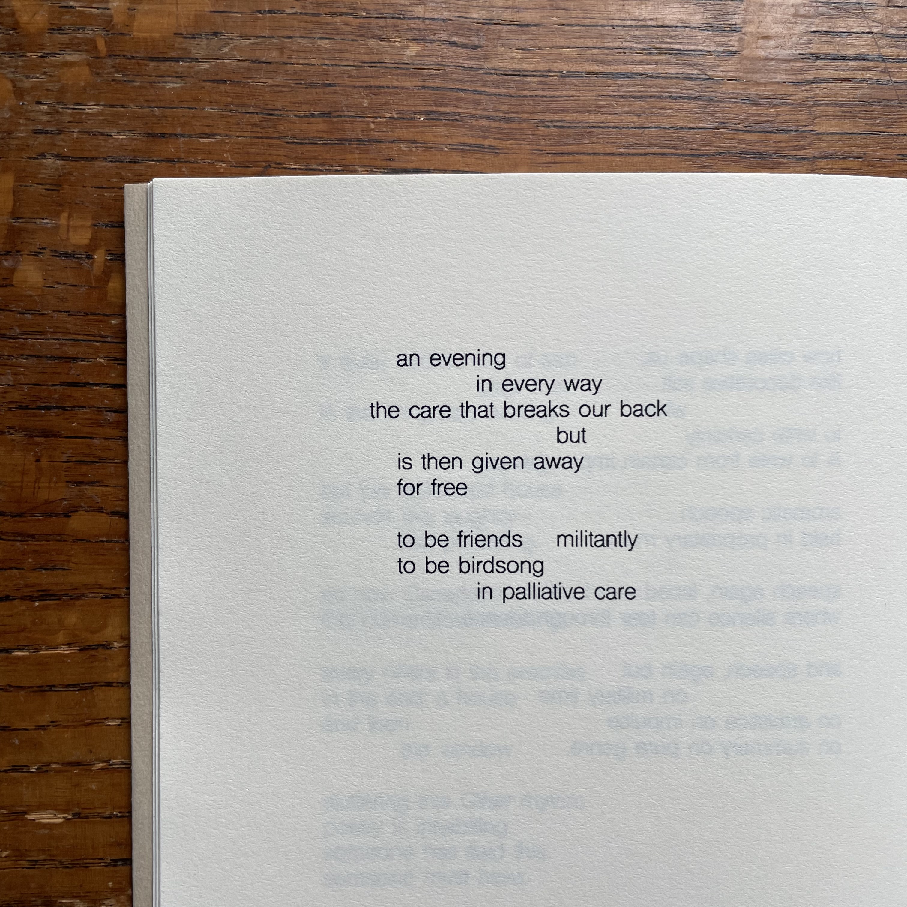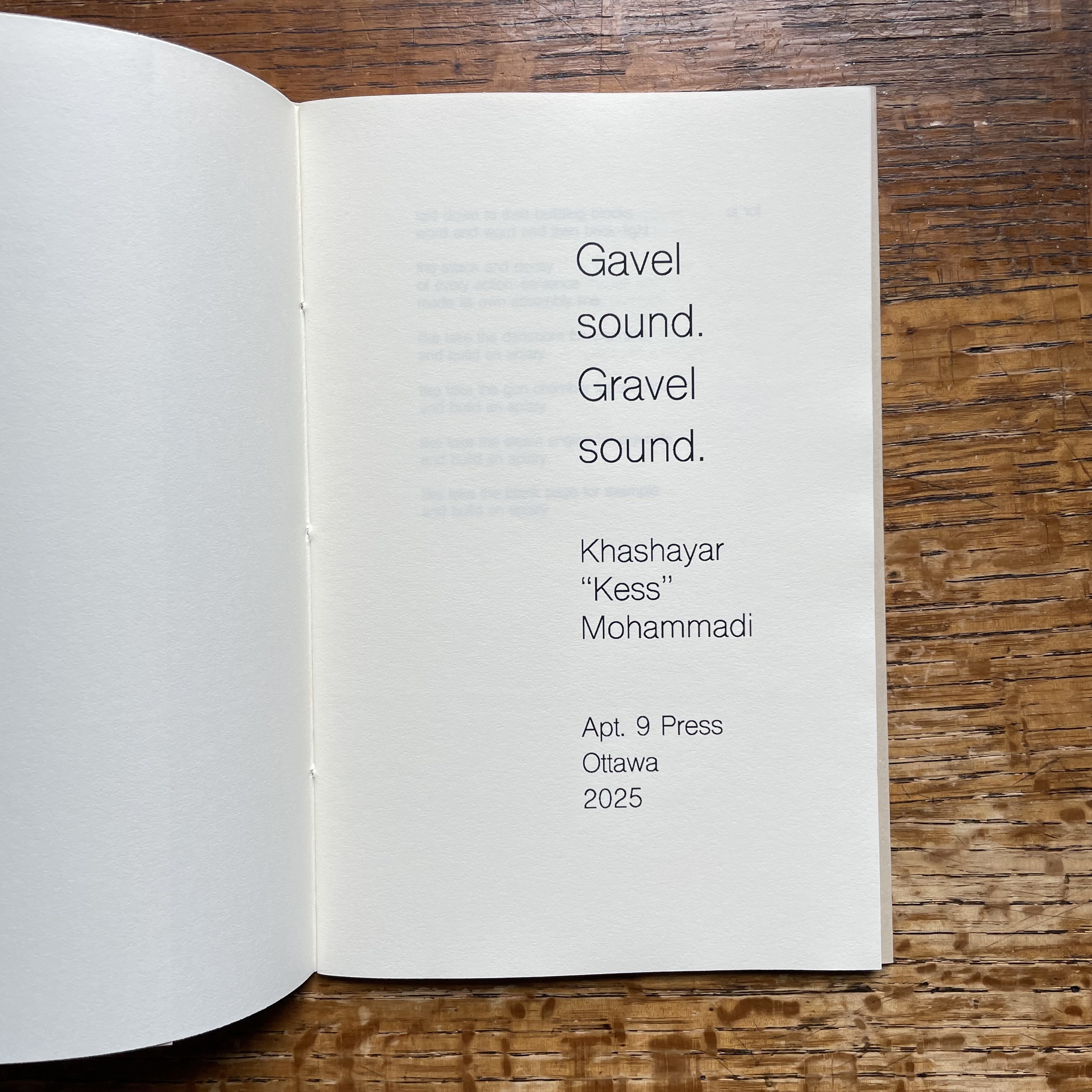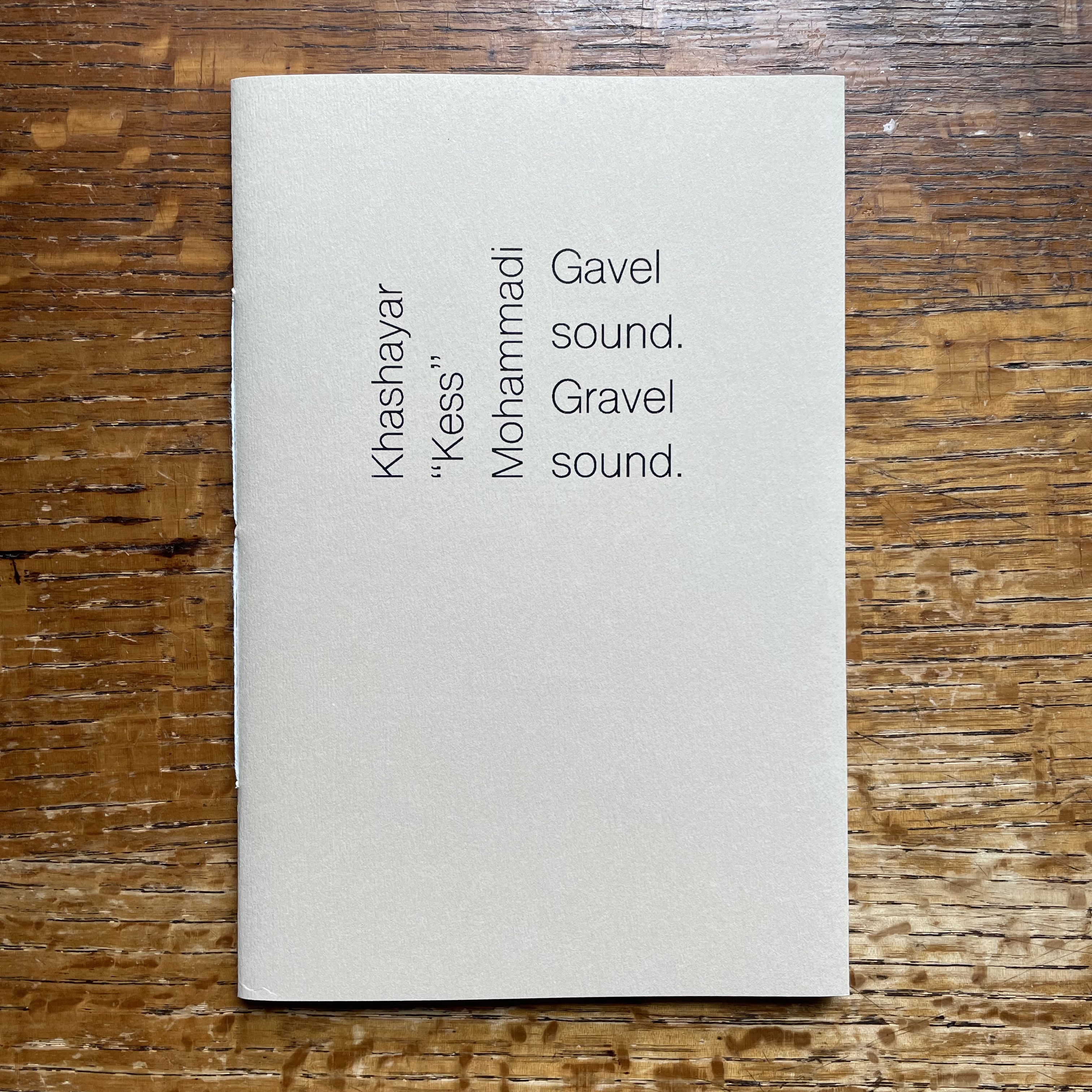 In Gavel sound. Gravel sound. Khashayar “Kess” Mohammadi continues their exploration of the chapbook as one unit of composition for poetry. In poems “laid down to their building blocks”, Mohammadi considers words, speech, and the blank page against the twenty-first century, and what it would or could mean “to be friends militantly / to be birdsong / in palliative care”.