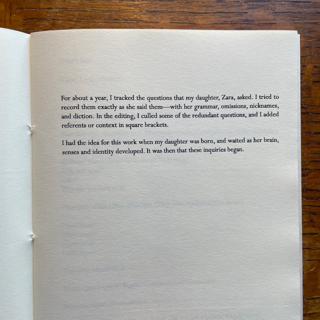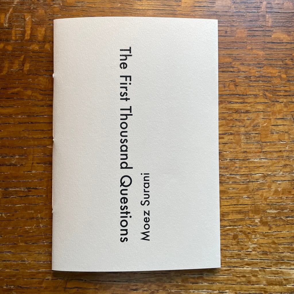 In The First Thousand Questions, Moez Surani spends one year recording and annotating the questions asked by his young daughter. In this documentary work, Surani traces his daughter’s developing awareness of the world—of her place in it, of the people who make up her particular corner of it, and of how language can help to navigate it. “I had the idea for this work when my daughter was born, and waited as her brain, senses and identity developed. It was then that these inquiries began.”