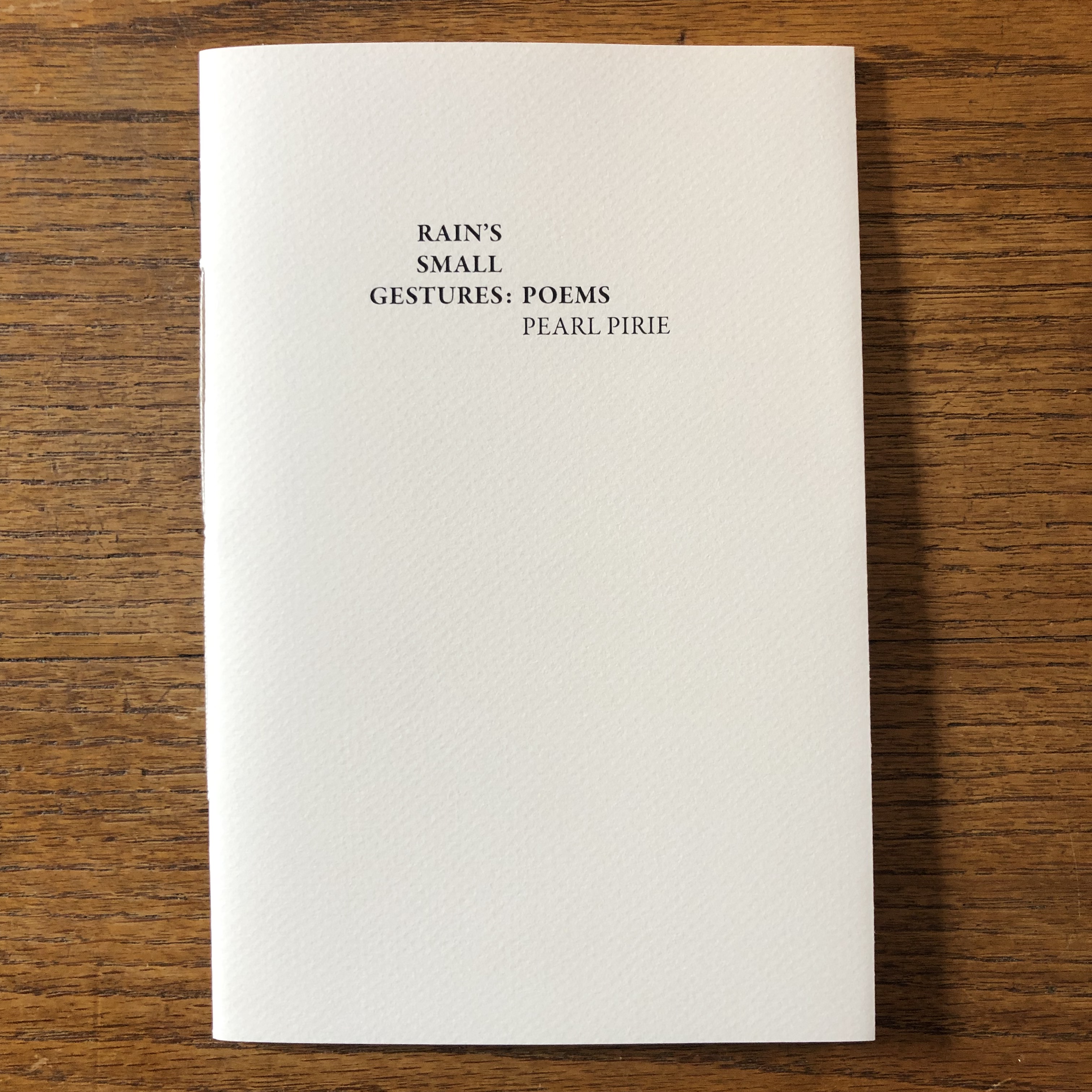 rain’s small gestures pushes Pearl Pirie’s characteristically attentive poetry towards the minimalist. These poems explore the overlap between the poet’s tendencies to both the lyric and the haiku, moving between immediate perception and the observation of memory. “I too search unlikely places”, she writes.