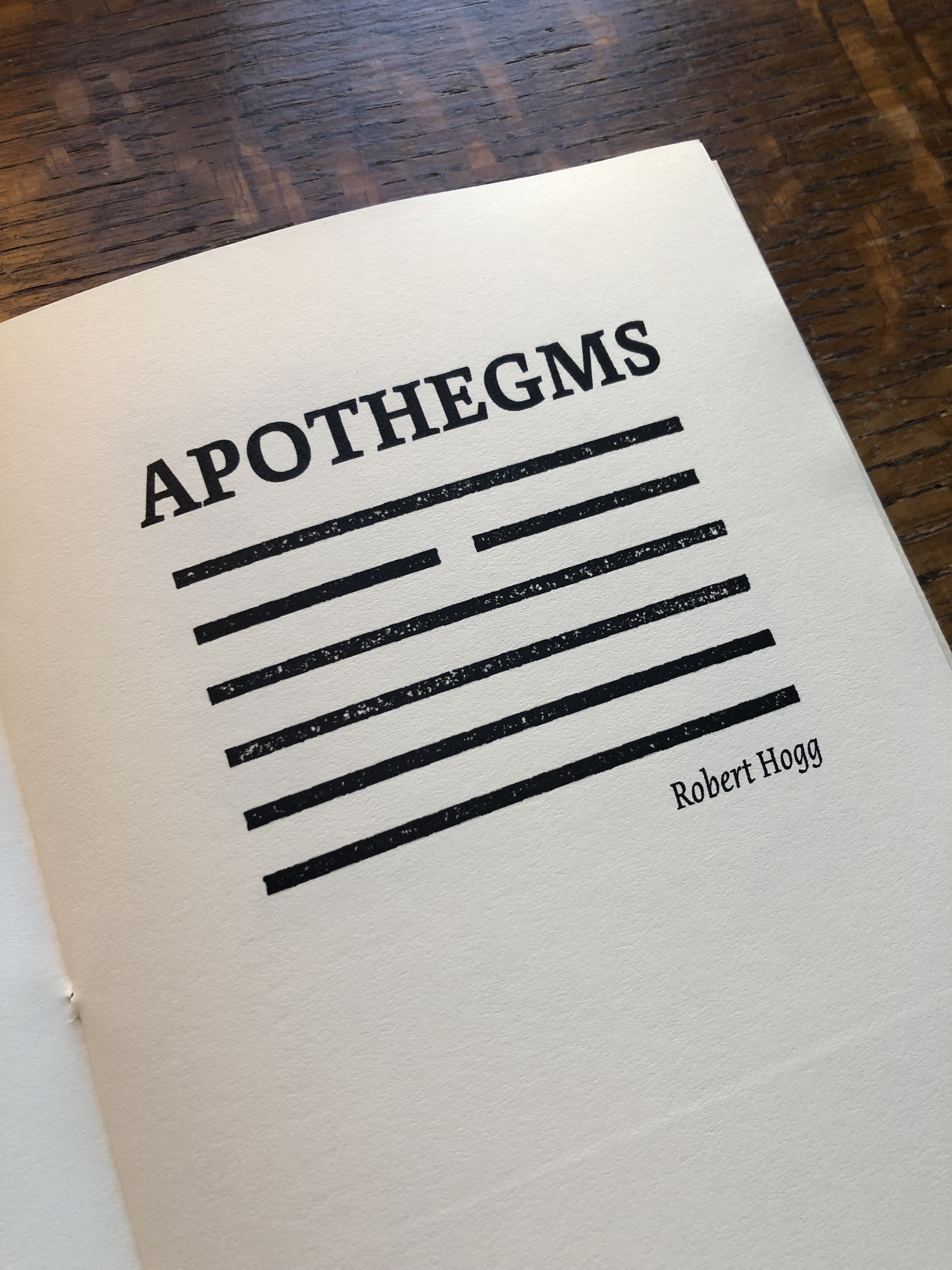 Although a minimalist impulse has run through Robert Hogg’s poetry since his debut (The Connexions, 1966), Apothegms is his first book composed solely of short poems. With humour and grace, he marks the passing of time by looking at the state of things around him, and considers what poetry continues to offer: “I keep getting / more time // to write / all this // then / less”.